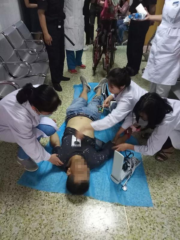 6月21日下午15:08分,在我院门诊楼二楼东侧挂号台的护士正在给患者挂号,突然听到有人大声呼喊:“护士护士,有人晕倒了!”挂号护士立即起身奔跑过去,看到患者晕倒在过道候诊椅子上,面色苍白,大汗淋漓,腿上有血迹呕吐物。立即呼叫最近的心内科诊室的医生抢救患者,并启动门诊突发事件应急预案。通知急诊科、保卫科,联系心电图室,报告门诊办……紧张而又有序地抢救开始了。产科门诊检查室护士拿来治疗单让患者平躺到地上,心内科医生为患者测量血压,心电图室医生为患者做心电图,消化科医生询问患者病史,导医护士帮忙联系家属。