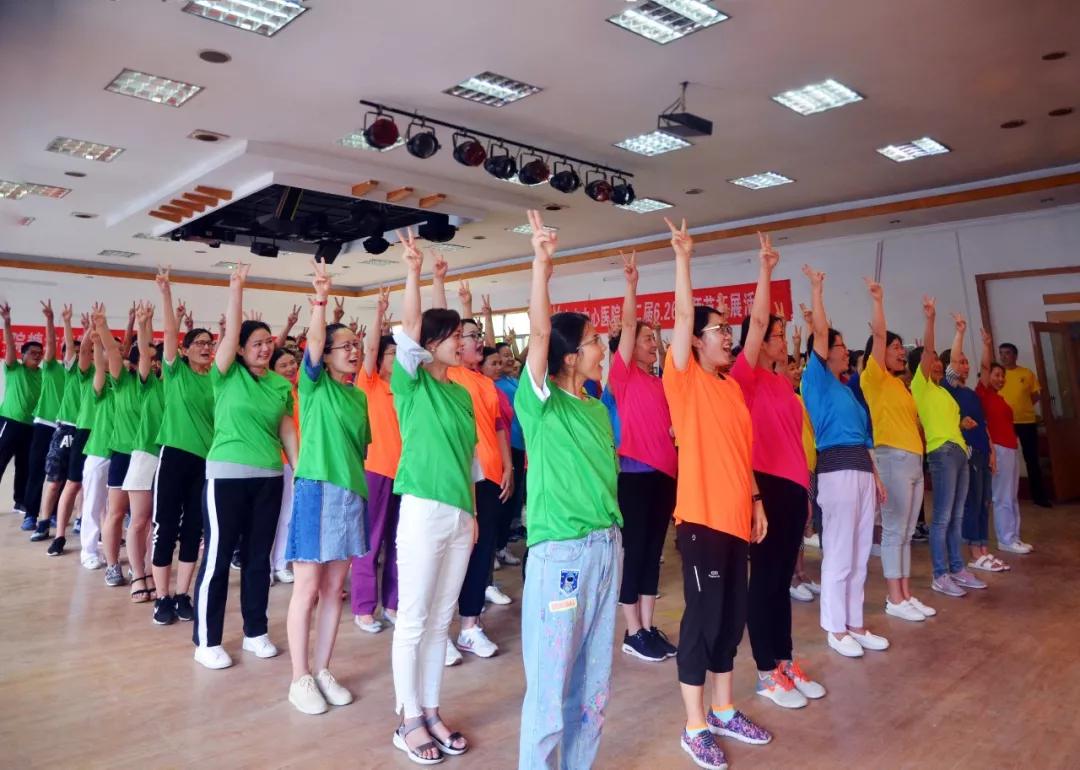来自临床医技科室的部分医务人员及院领导、部分行政中层的百余人参与了本次拓展活动。正式训练前,教练通过参训人员报数完成8个团队的人员分配。各队推选出队长、副队长等小组干部,集思广益地商定好小组代号和朗朗上口的口号,换上色彩缤纷的“战袍”,雄赳赳气昂昂地进入备战状态。场外观众也积极融入本次活动,与参训人员同乐,为他们出谋划策、呐喊助威。下午1点30分,李建英副院长宣布拓展活动正式开始。在教练的指导下,全体人员在开营仪式、团队组建、一圈到底、汉罗塔传递、梯形拍手等活动项目上进行了小组积分赛pk。队员们或急才急智,或实力担当,形成良好配合,每个人都在为自己队伍的胜利出谋划策,奋力拼搏。场外观众也深受鼓舞,为之欣喜为之欢呼。在紧张比赛的中场休息时间里,队员们还欣赏到来自医务科杨娟倾情演唱的陕北名歌《三十里铺》,普外一科郑晨主治医师、心内科卢博医师、眼科王晟宇医师合作吉他伴奏演唱的励志歌曲《奔跑》。