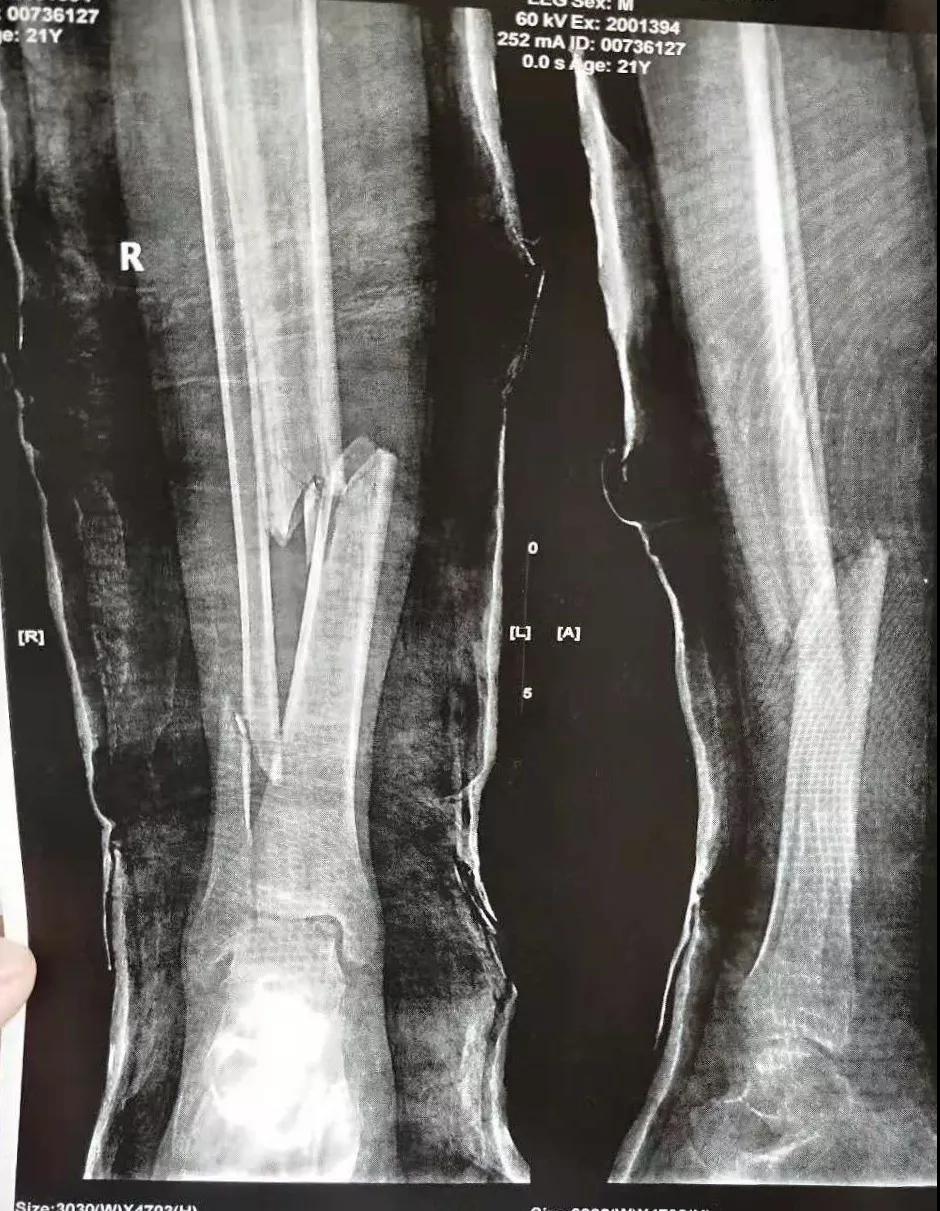 这名21岁的男性患者一个月前因车祸致伤,在当地某三甲医院确诊为右胫腓骨粉碎性骨折,骨折移位明显,建议手术治疗,因既往患严重慢性再生障碍性贫血病史16年,一般状况差,需长期输注血液制品维持三系细胞水平,麻醉及手术风险极高。虽经当地积极内科治疗,患者一般状况仍差,无法耐受手术治疗。患者及家属经多方打听,抱着最后一丝希望来到我院骨二科求治。