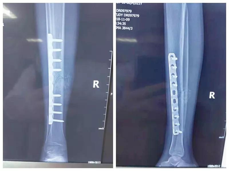 骨二科张延平主任接诊后经仔细询问病史,详细阅读近期X线、CT等病历资料,认为患者骨折移位明显,目前骨折无任何愈合迹象,若保守治疗,骨折将无法愈合,后期不能下地活动,严重影响患者生活质量。同时患者合并慢性再障,血常规结果各项指标均极低,围术期发生麻醉意外、大出血、感染等风险极高;而我院作为西安市级最大的三甲综合医院,综合实力深厚,既往相关疾病治疗经验丰富,多次通过多学科诊治为合并复杂内科疾病患者保驾护航,为患者创造手术时机,提高患者生活质量,遂将患者收住院。住院后,立即成立了由张延平主任、杨寅副主任、山卉护士长、梁晨主治医师、刘邦定主治医师、李鑫护师组成的手术治疗小组。经初步检查,患者血常规结果较当地检验结果更差,三系细胞均极低,其中血小板仅为1(正常值为100-300),血红蛋白55g/L。遂立即请血研所李罡灿主任医师会诊,给予升高白细胞、纠正贫血、升高血小板等治疗,经积极治疗患者血常规各项指标均较入院时改善。张延平主任再次组织由血研所李罡灿主任医师、麻醉科崔晓岗主任、感染科付建军主任、药剂科韩小年副主任药师等参加的术前讨论。讨论后一致认为患者目前各项指标虽然较入院时改善,但因其慢性再障病史长,骨髓造血及储备能力极差,围术期发生大出血、伤口感染甚至全身感染等风险仍极高,术中及术后需准备大量血小板防止大出血,同时需高度警惕手术切口、取骨区术后发生感染。为尽快为患者施行手术,治疗小组积极联系输血科为患者备血,并为患者制定了围术期抗感染方案;在我院输血科存血量严重不足的状态时,输血科张养民主任亲自联系市中心血站为患者准备手术中及术后所需的血小板制品。手术小组为患者制定了周密的手术方案及风险预案,10月31日,在麻醉科王永宏副主任医师、手术室高洁、赵耀护师的配合下,为患者施行了右胫骨粉碎性骨折切开复位、髂骨取骨植骨内固定术,手术历时70分钟,安全返回病房。术后患者渗血多,1周内连续每日平均渗血超过100ml,并出现发烧,最高39℃,复查血常规三系细胞较术前再次明显降低。李罡灿主任医师、付建军主任、韩小年副主任药师多次来科会诊,及时调整患者的治疗方案,输血科再次为患者的救治提供了强有力的支援和保障。在山卉护士长带领的护理团队精心护理下,患者未发生压疮等卧床并发症。目前该患者术后恢复良好,已出院进行下一步康复治疗。