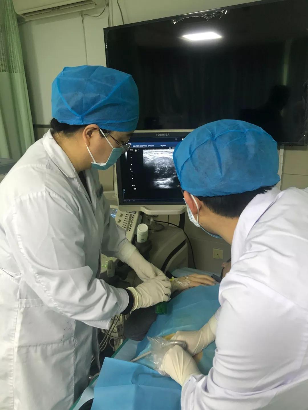 目前在我院,对于贴近胸膜的肺部病灶,利用超声引导经皮肺穿刺活检已成为获得病理结果的首选方法,效果良好,基本无严重并发症,为很多肺癌患者早发现早治疗,为良性结节早定性早放心。这项技术的突破,特别感谢我院呼吸科、胸外科、肿瘤科、CT室团队的大力支持与强力保障。