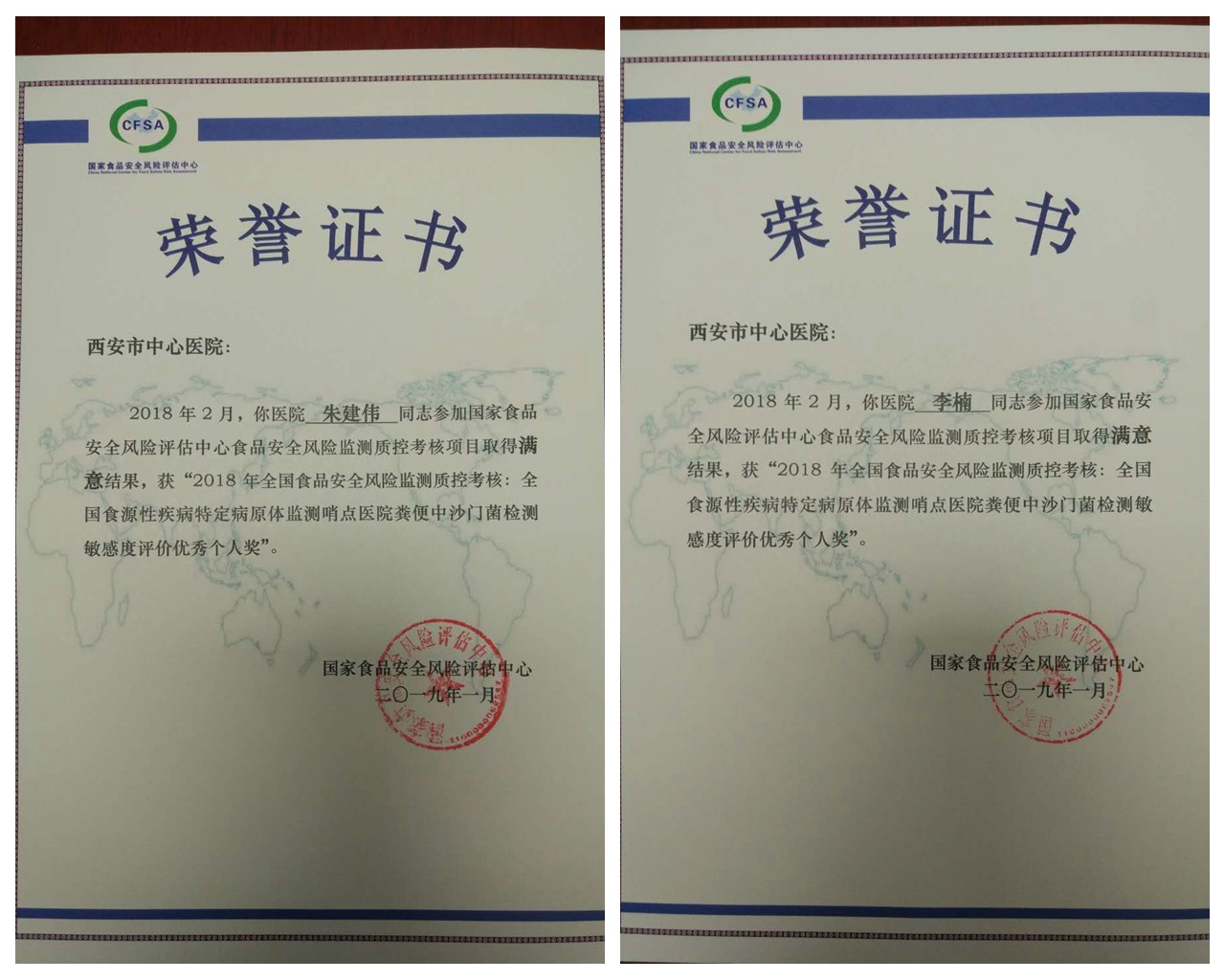 2018年2月,全国26各省(区、市)食源性疾病特定病原体监测哨点医院或疾病预防控制中心共计440家机构,参加了国家食品安全风险评估中心委托参比实验室实施的食品安全风险监测质控考核项目——全国食源性疾病特定病原体监测哨点医院粪便中沙门菌监测敏感度评价。西安市仅有2家医院获得“质控考核证书”,我院即为其中一家。我院检验科朱建伟和李楠两位同志参加该考核项目取得满意结果,荣获“优秀个人奖”。