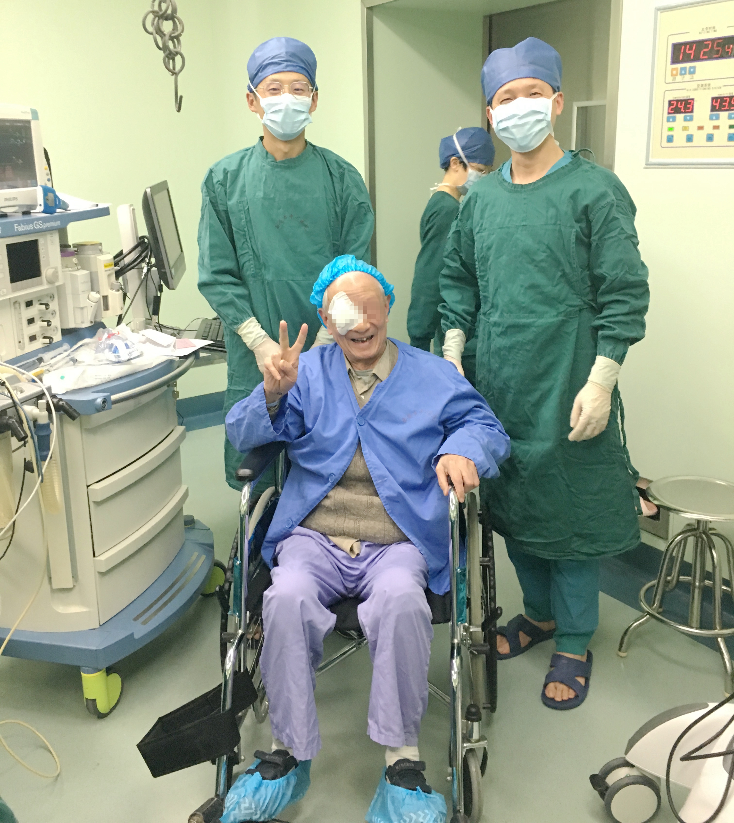 对于眼科医生和患者来说,最值得高兴的便是患者重建光明的那一刻,已有94岁的高龄袁老先生在我们为他顺利完成手术后摆出了胜利的手势,那一刻他脸上洋溢的笑容令我们眼科医生倍感鼓舞。