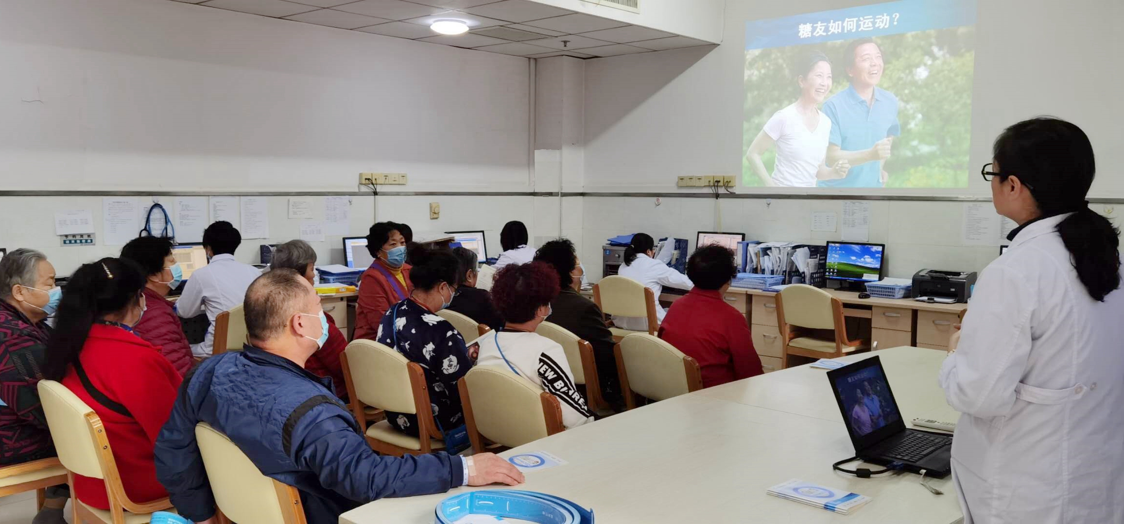 为了让更多的人重视糖尿病及并发症带来的危害,内分泌科王芳主任医师于11月10日14:30为糖尿病患者及家属进行了《糖友如何运动》的科普讲座。在历时40分钟的讲课中,王芳主任从规律运动的好处、糖友运动的“三大纪律”、“八项注意””、合并有并发症的糖友如何运动以及糖友出游时的注意事项及准备工作,深入浅出的为糖尿病患者讲解了糖尿病运动相关知识,并认真解答了大家的疑惑。最后,王引娣主管护师为大家发放了健康宣教资料,讲解并演示如何正确测量腰围。
