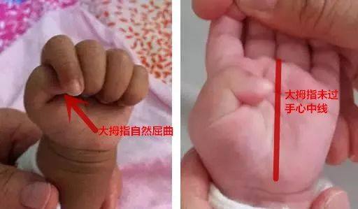 有些脑损伤的宝宝,出现拇指内收的情况,表现为拇指内收横过掌心。正常两三个月的宝宝握拳时拇指屈曲,有的家长误认为拇指内收,从而产生紧张焦虑的情绪。我们可以通过定期体格检查从而发现问题,通过被动抓握练习及按摩刺激来改善宝宝拇指的内收状态。