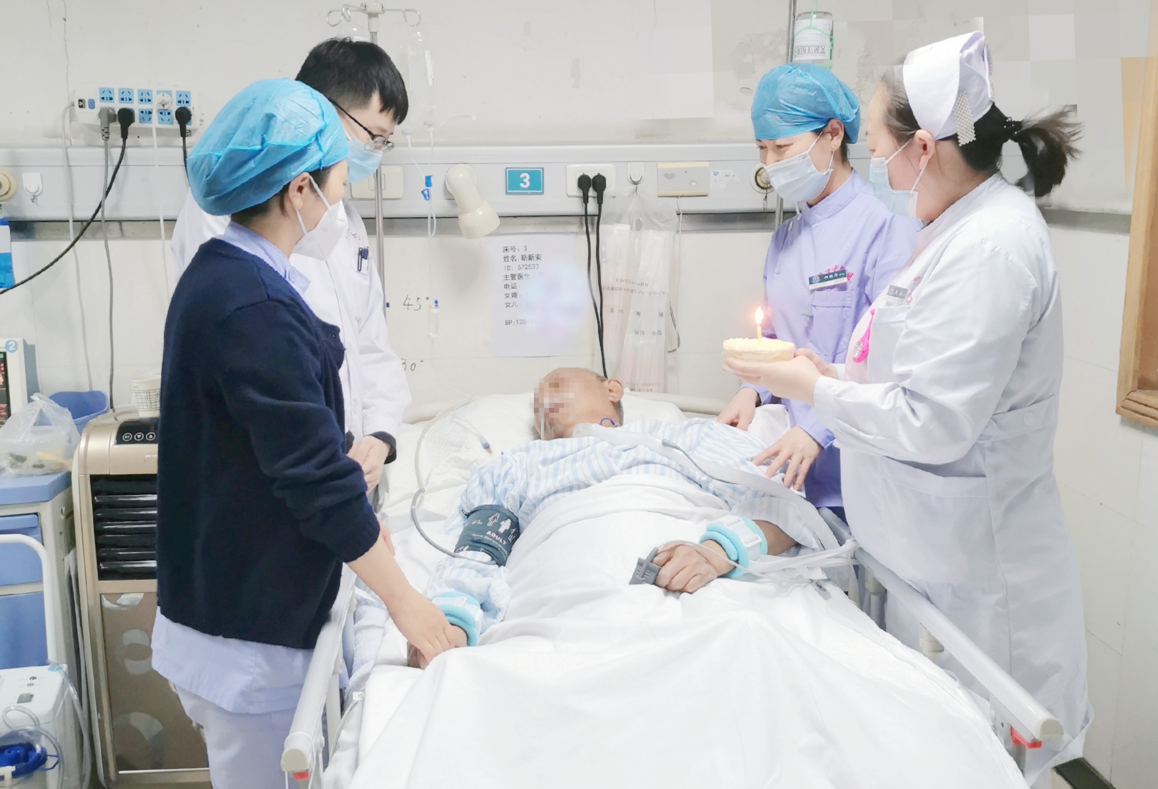 和冬日暖阳一样温暖的还有神经外科护理团队的优质服务和爱心送暖。这天一大早,因左侧基底节区脑出血破入脑室而入住神经外科ICU的患者靳先生家属来给患者送饭,患者女儿给靳先生带了4个煮鸡蛋,神经外科的值班护士几番推辞之后,患者女儿很不好意思地说:“今天,爸爸过生日。” 每一年靳先生的生日都是阖家团聚、隆重热闹的大日子,而今年却要在医院里度过了。王瑜护士长得知这个消息后,和姐妹们一合计,心中便有了主意,不如我们给他在ICU里过生日吧。护士长给患者订了一个小小的蛋糕,跟主管医生、当班护士一起给患者唱了生日歌,阳光和爱洒满ICU,温馨而感动。
