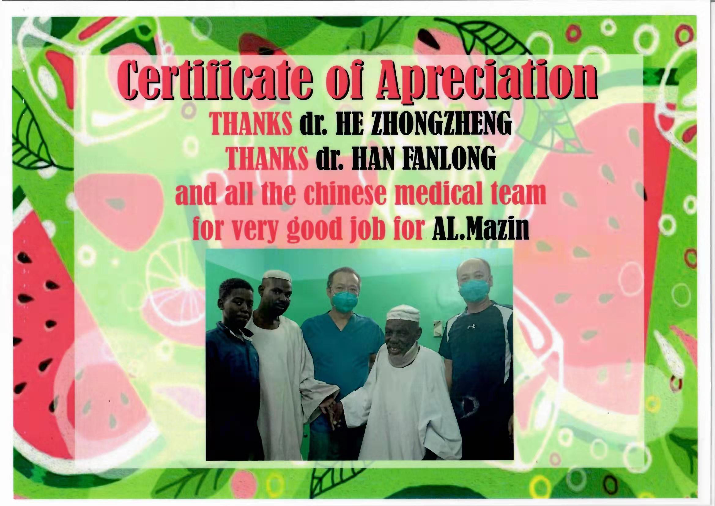 桃李不言、下自成蹊,贺中正医师的援非任期被评为优秀等次。他实实在在的工作,当地医院领导、华人医院领导,甚至病人家属也都看在眼里,纷纷送来了诚意满满的感谢信,恩图曼友谊医院院长还书面写信请贺中正医生延长工作,尽管由于后续安排,只能拒绝,但还是感动、感激、自豪。相信这些努力,都会转化为中苏友谊的涓涓细流。正如他说,救死扶伤源于我的职责所在,大爱无疆才是我对苏丹人民最好的心意。