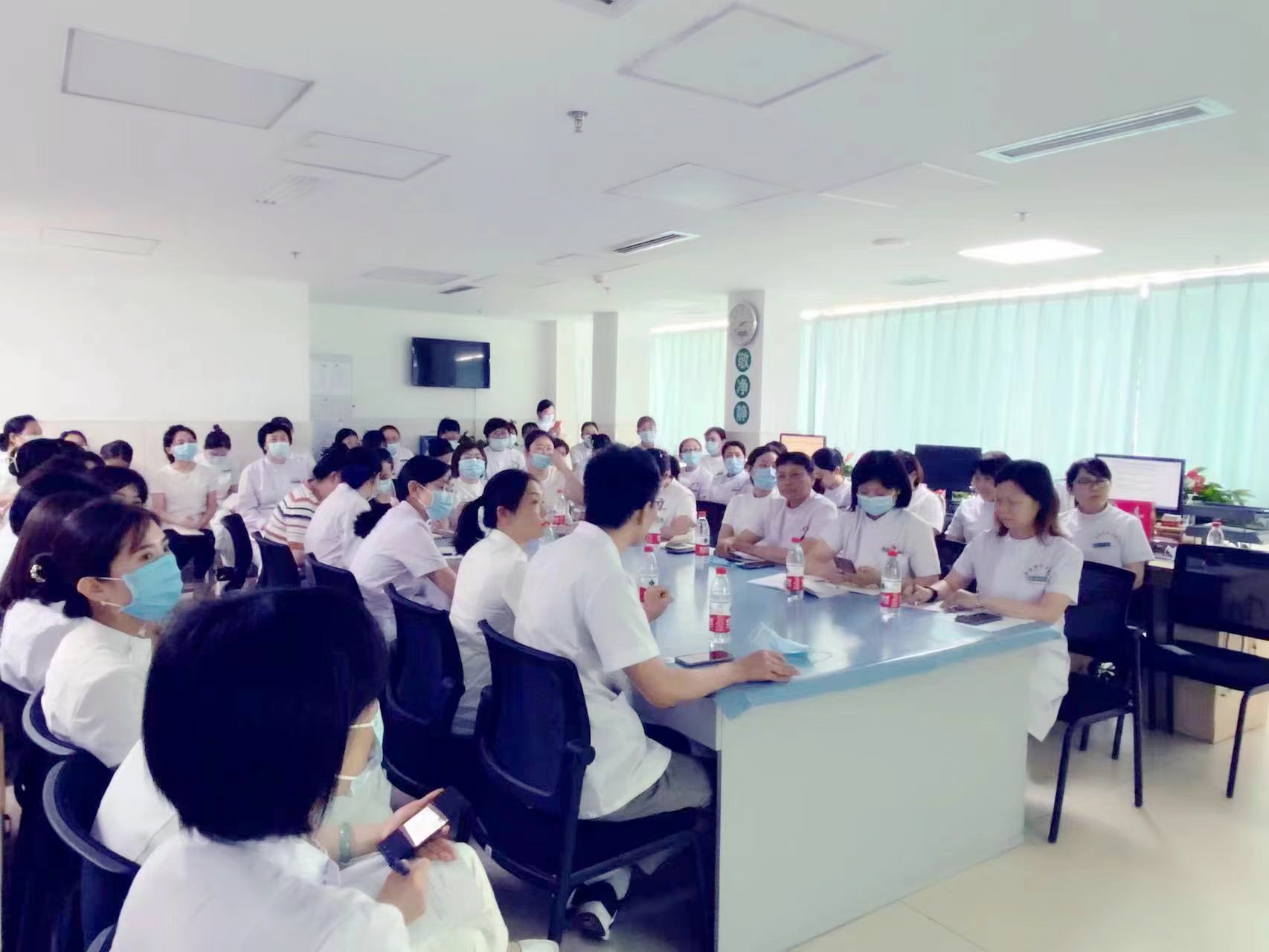 近年来,我国白血病的发病率呈逐年上升的趋势,不但为广大的患者和家属带来了极大的痛苦,而且对家庭、社会也造成了沉重的负担。然而,随着现代医学的进步,造血干细胞移植为他们带来了生命的曙光。为了更好地服务患者,提高科室的护理质量,2022年5月27日下午14:30,护理部在血液内科进行主题为造血干细胞移植患者的护理查房。查房由护理部张宝莉护士长主持,护理部王敏和来自全院的各科护士长及血液内科全体护士共60余人参加。