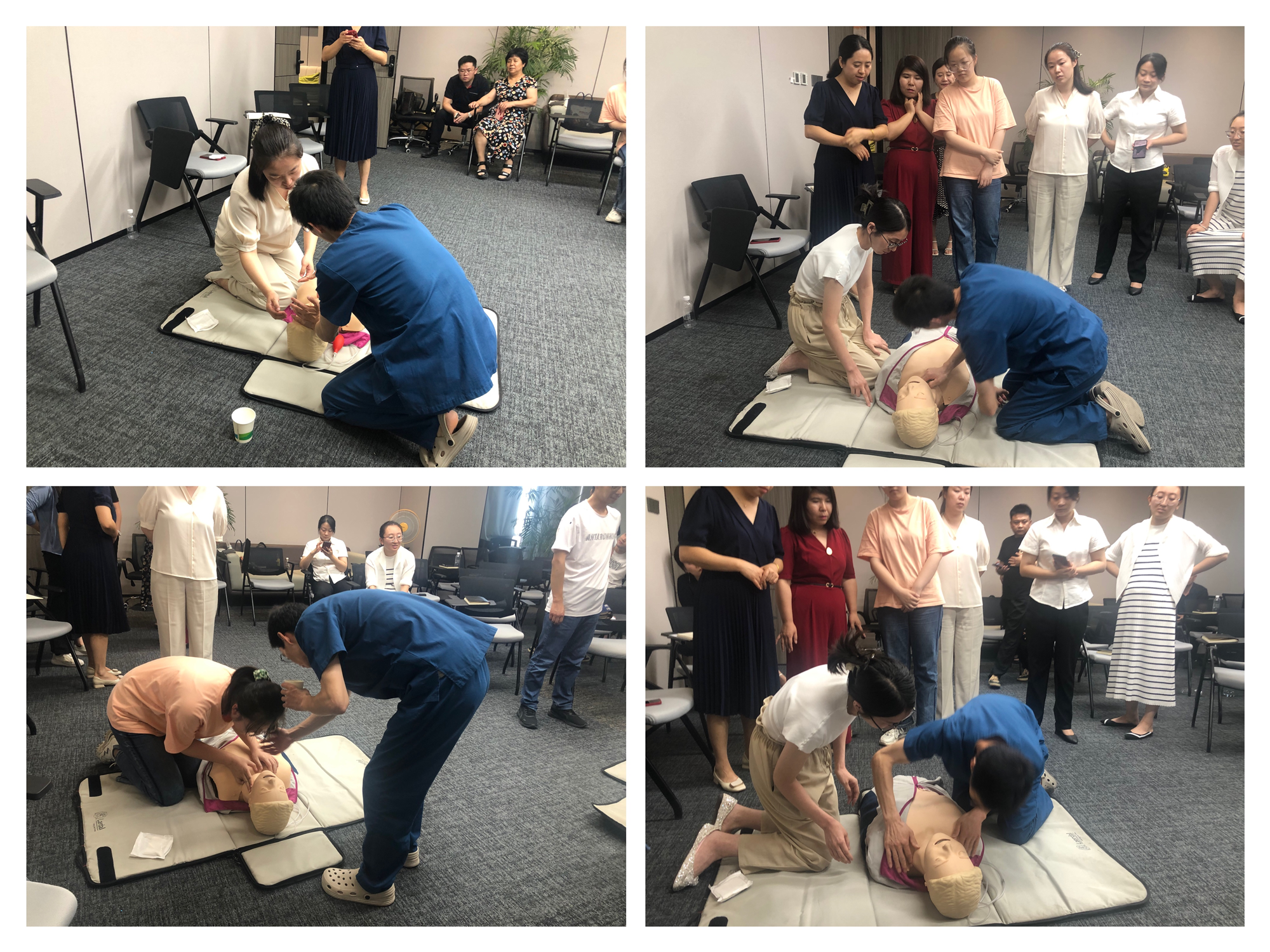 急诊科副主任医师孙为用生动的案例为大家引出了培训的主题,一个个发生在身边的惨痛教训,深深地吸引住了大家学习的热情,从急救的认知度和普及度,到心肺复苏操作的关键环节为大家进行了通俗易懂的讲解,并与急诊科主管护师冯阳为在场的员工进行了手把手的实操练习。
