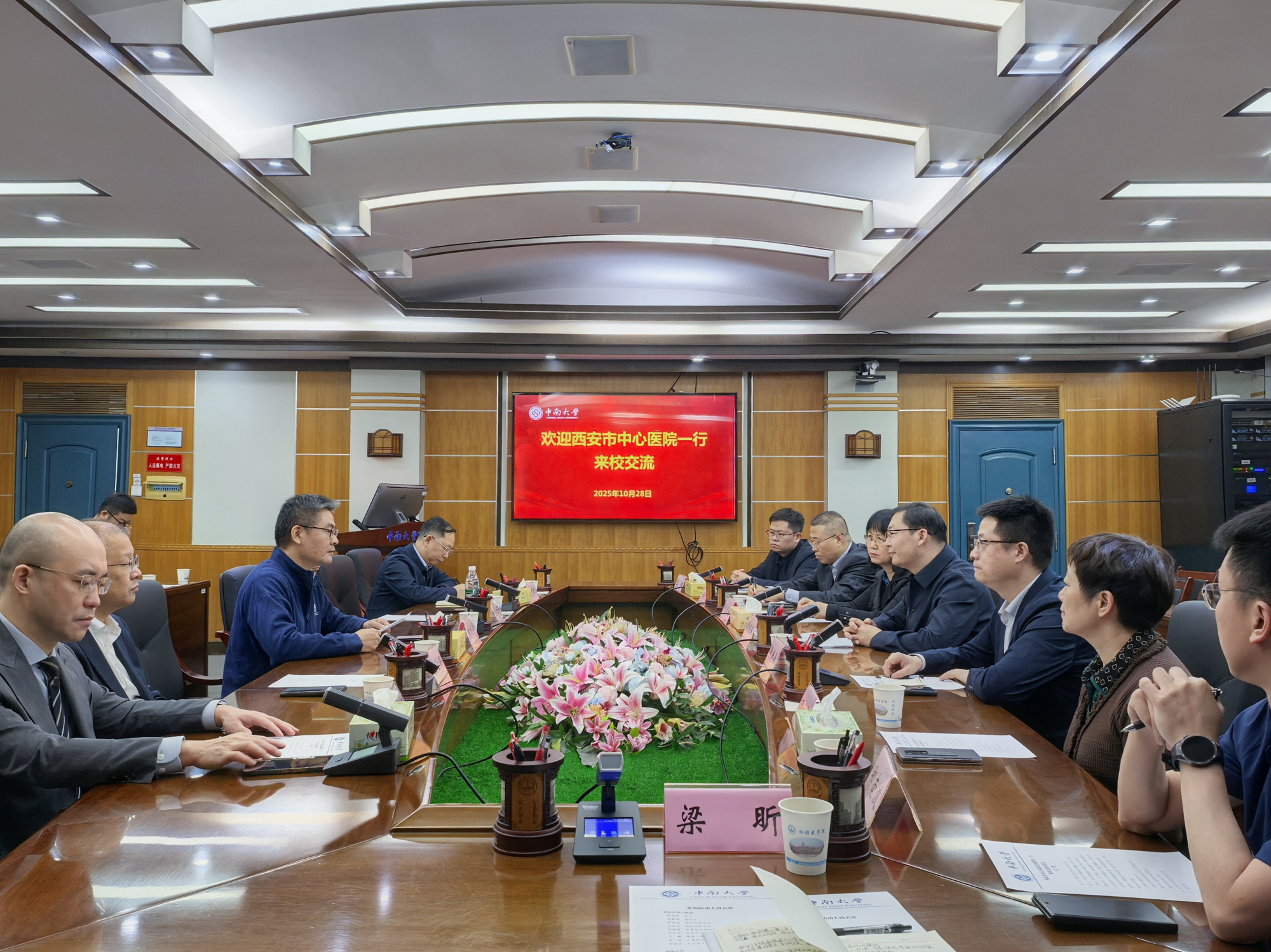 2025年10月28日,按摩视频 院长胡明军、副院长张静涛一行前往中南大学湘雅医学院交流座谈。湘雅医学院党委书记朱利勇、中南大学医院管理处处长彭仕芳、湘雅医学院党委副书记吴世明、副院长黄志军、副院长黄耿文参加座谈。