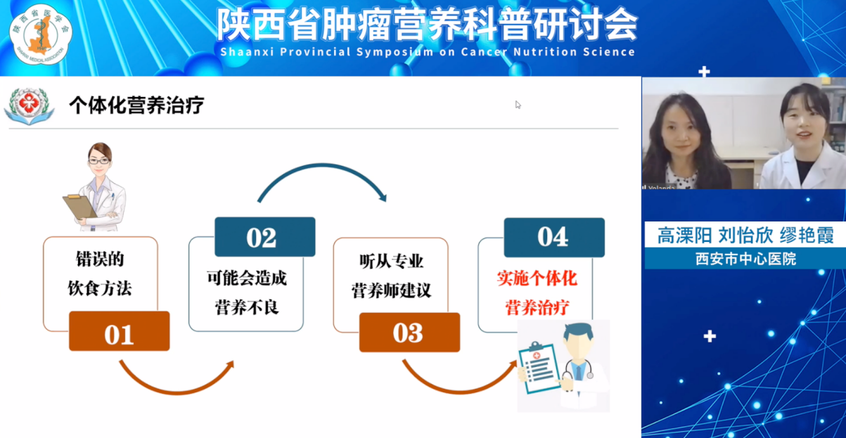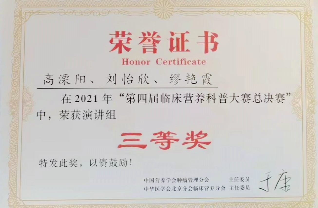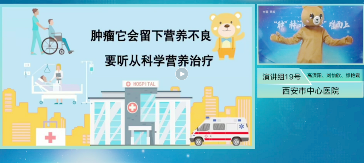 2021年11月29日,由陕西省医师学会临床营养分会主办的陕西省肿瘤营养科普研讨会线上举行,来自陕西省各大医院的14支队伍参加了本次比赛,会上围绕肿瘤营养相关内容进行科普演讲比拼,最终我院在营养科王芳主任指导下,经过充分排练,多次调整细节,在比赛中凭借出色的发挥,夺得陕西省一等奖,挺近决赛。