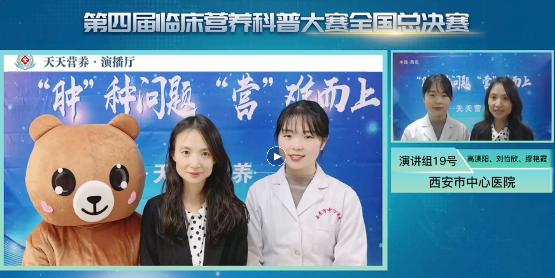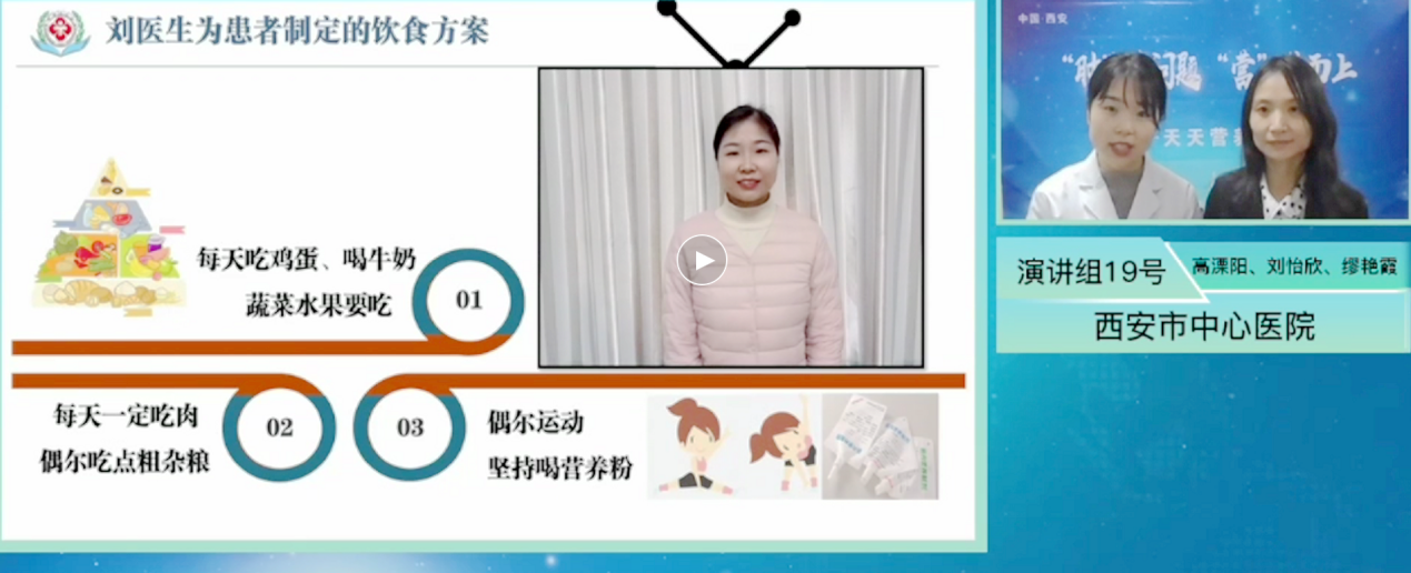 2021年12月17日,我院营养科代表陕西省参加全国总决赛。自陕西省赛结束后,营养科全体人员再接再厉,将省赛中积累的演讲经验融入作品,增强了作品的流畅性。同时,增加体现作品背景的海报、增加更有吸引力的自制小道具、增加更具说服力的录像内容,不断提高作品质量,力求在全国赛场上,展现中心医院营养人追求卓越、不断创新、勇于担当的社会形象,最终,经过激烈角逐,在决赛的24个演讲作品中,荣获全国三等奖。